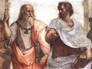 P. D.: En la foto tenéis las figuras centrales del cuadro La Escuela de Atenas, de Rafael. El de la izquierda representa a Platón, filósofo que inauguró el idealismo y apunta hacia arriba, mostrando que lo importante son las ideas. A su lado aparece su discípulo Aristóteles, quien postuló el realismo del mundo natural y apunta hacia abajo, pues es la physis lo que debe ser estudiado (en concreto el cambio que se produce en ella).